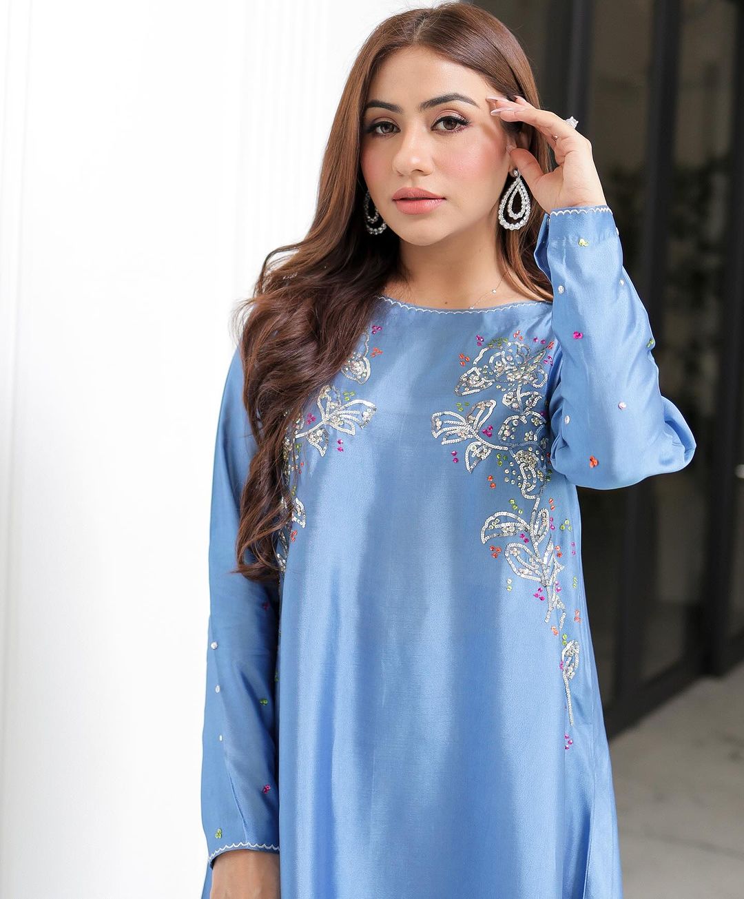 This stunning dress features exquisite handwork with intricate detailing. Each stitch adds elegance and uniqueness, perfect for special occasions. It combines timeless beauty with contemporary style.