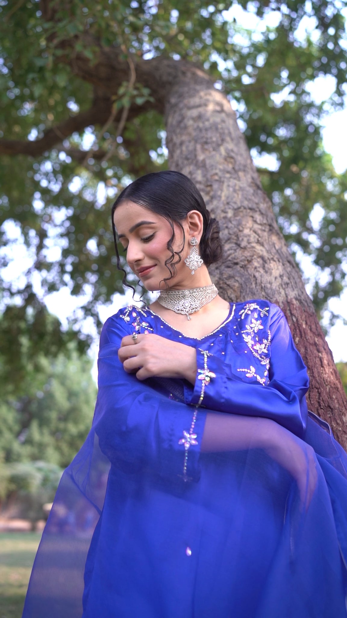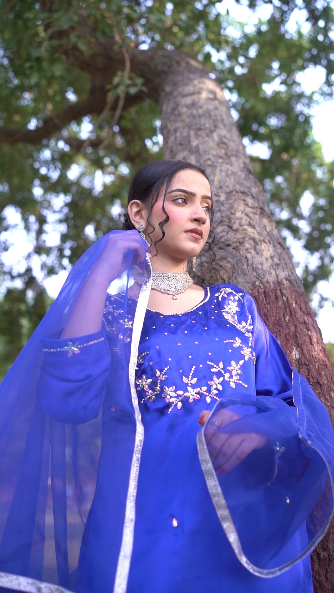 Embrace elegance with our royal blue ensemble, adorned with hand-embellished multi-colored crystals and intricate sleeve detailing. Paired with a classic shalwar and an organza dupatta edged in delicate lace, this look exudes timeless charm and luxury. For those who seek sophistication with a touch of sparkle.