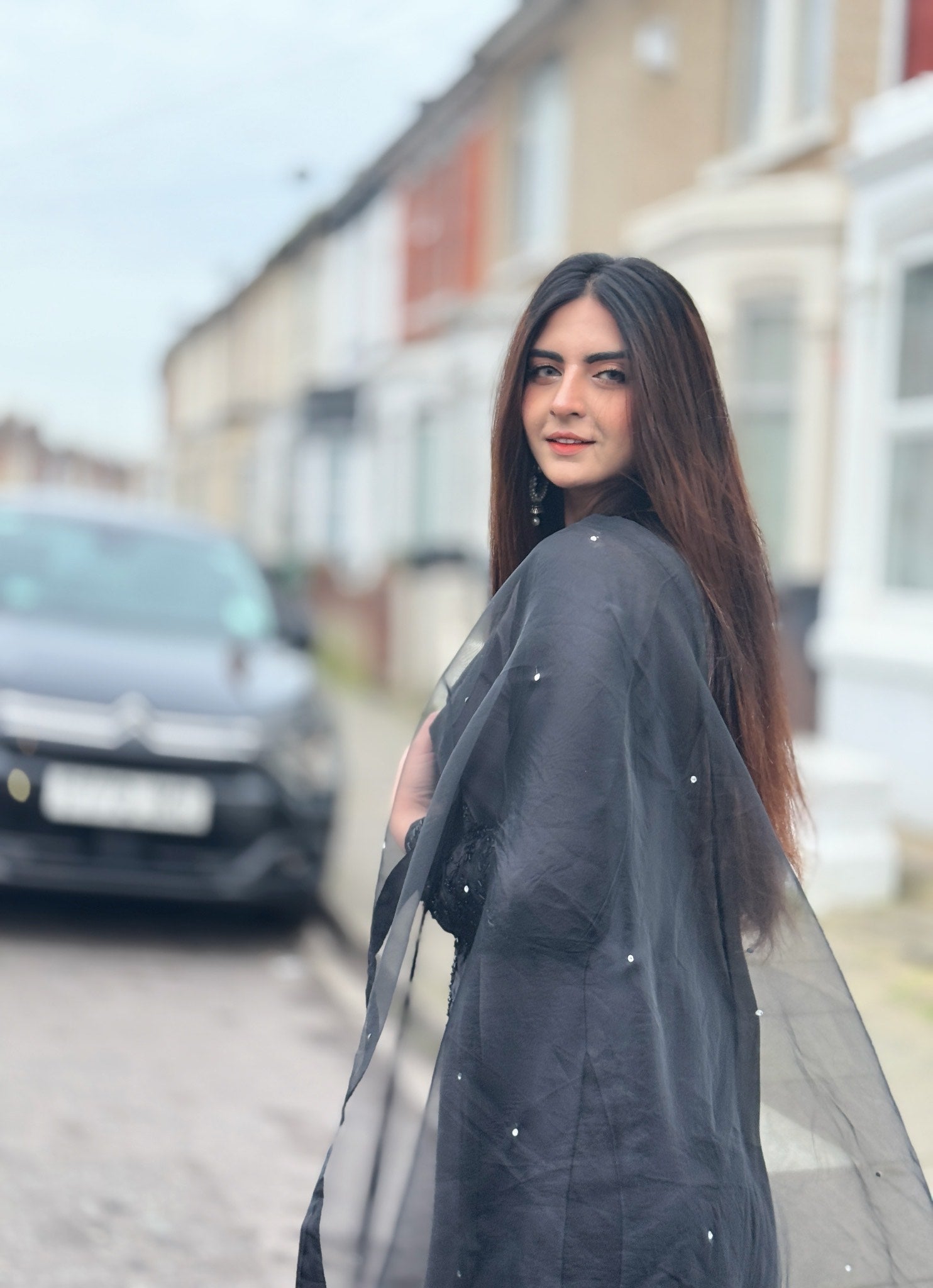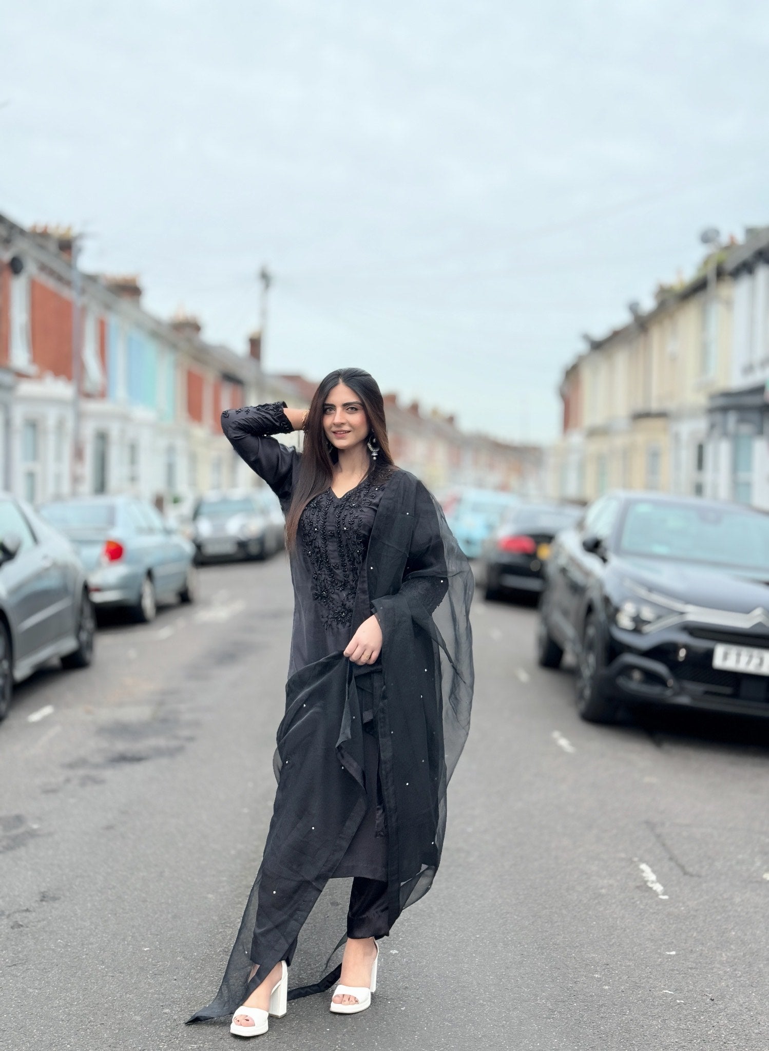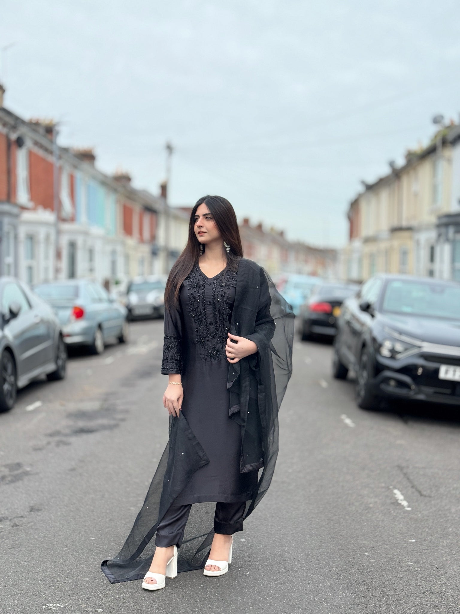 Draped in luxurious black silk, this ensemble exudes sophistication with intricate Resham work and crystal stones. Embellished sleeves add a regal touch, while the delicately edged dupatta flows gracefully. Paired with tailored trousers, it’s pure elegance for the woman who commands attention.
