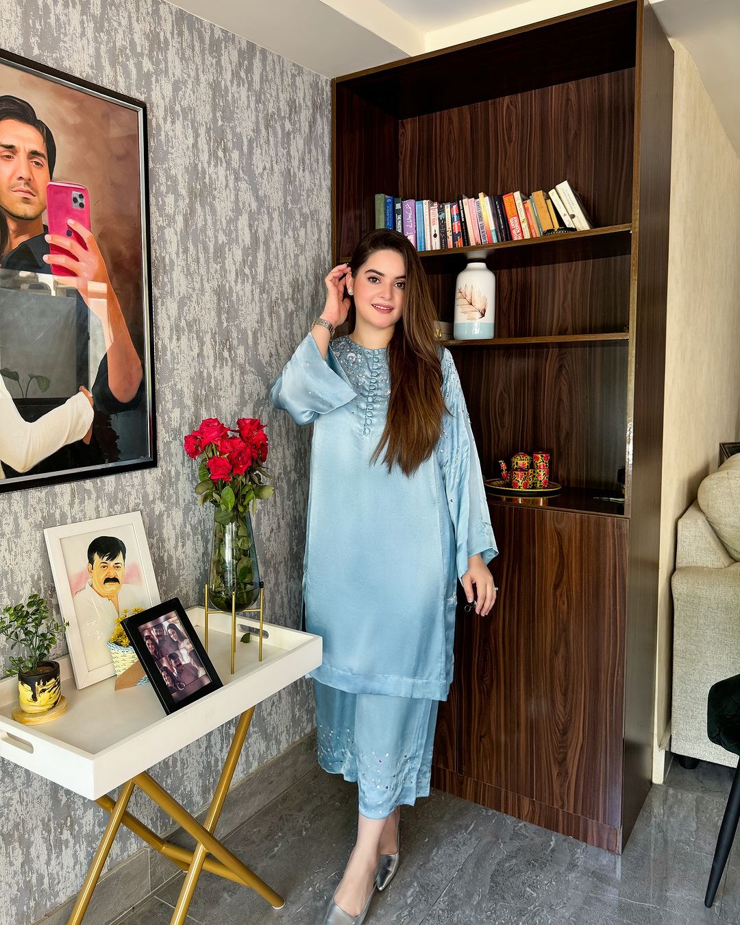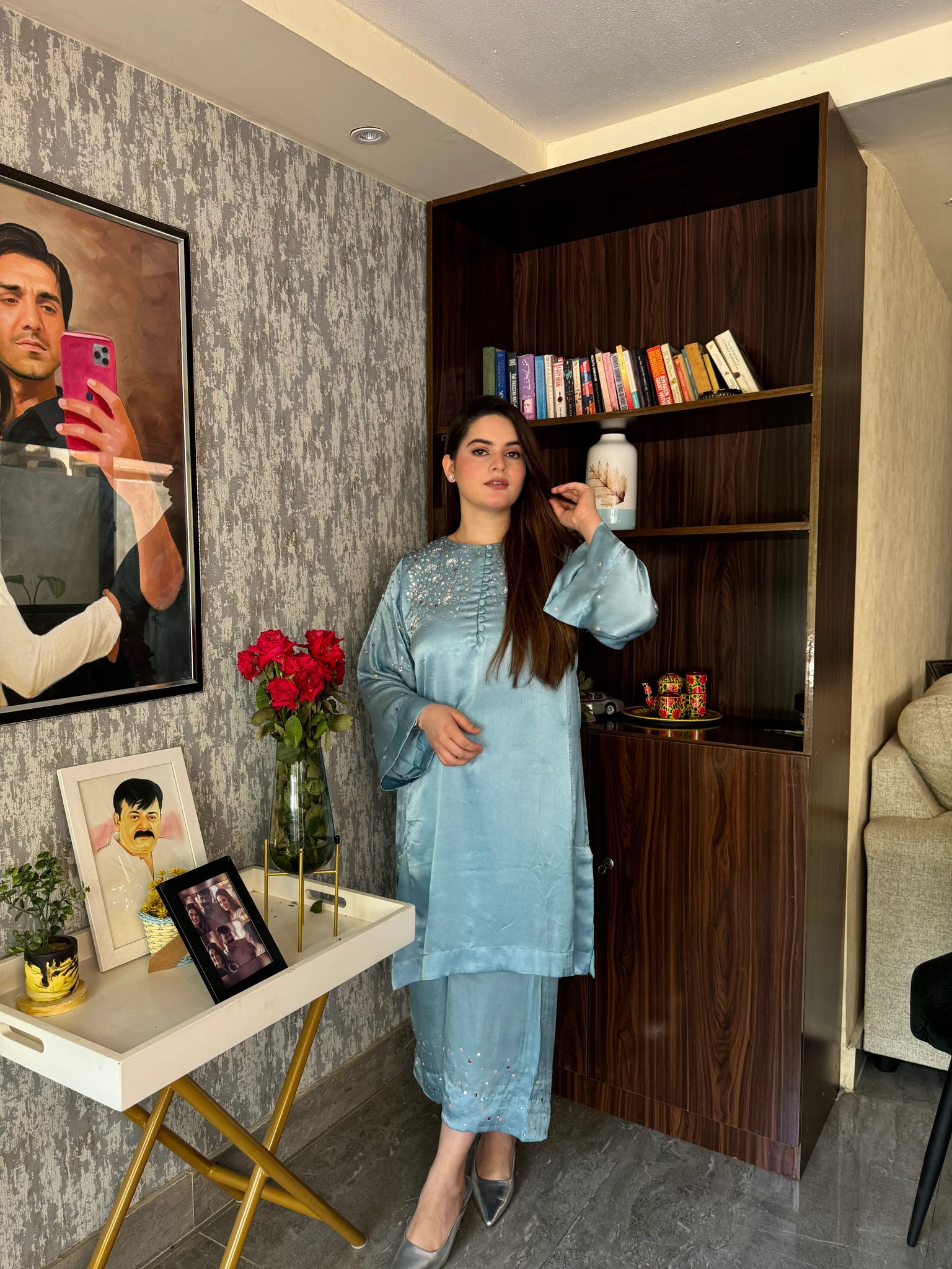 This stunning dress features exquisite handwork with intricate detailing. Each stitch adds elegance and uniqueness, perfect for special occasions. It combines timeless beauty with contemporary style.