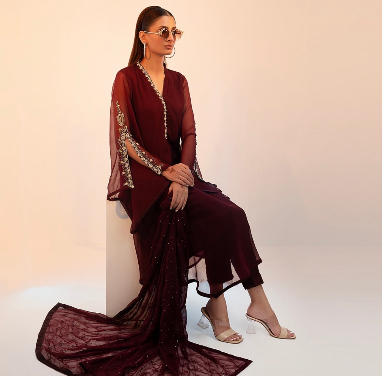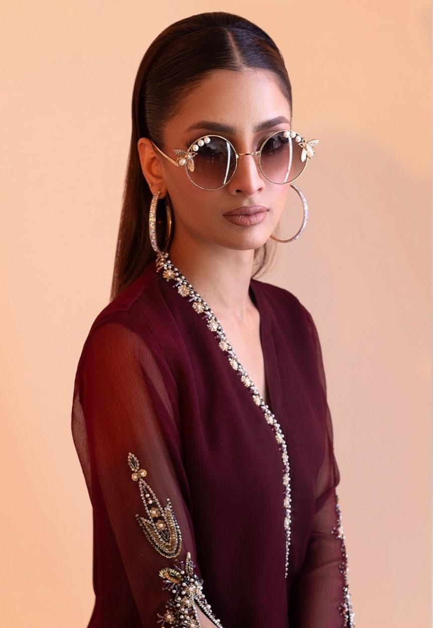 The outfit consists of a chiffon dupatta with intricate handwork, matched with chiffon frock and grip trousers. The dupatta showcases delicate craftsmanship, while the frock embodies elegance, blending traditional and contemporary styles seamlessly.