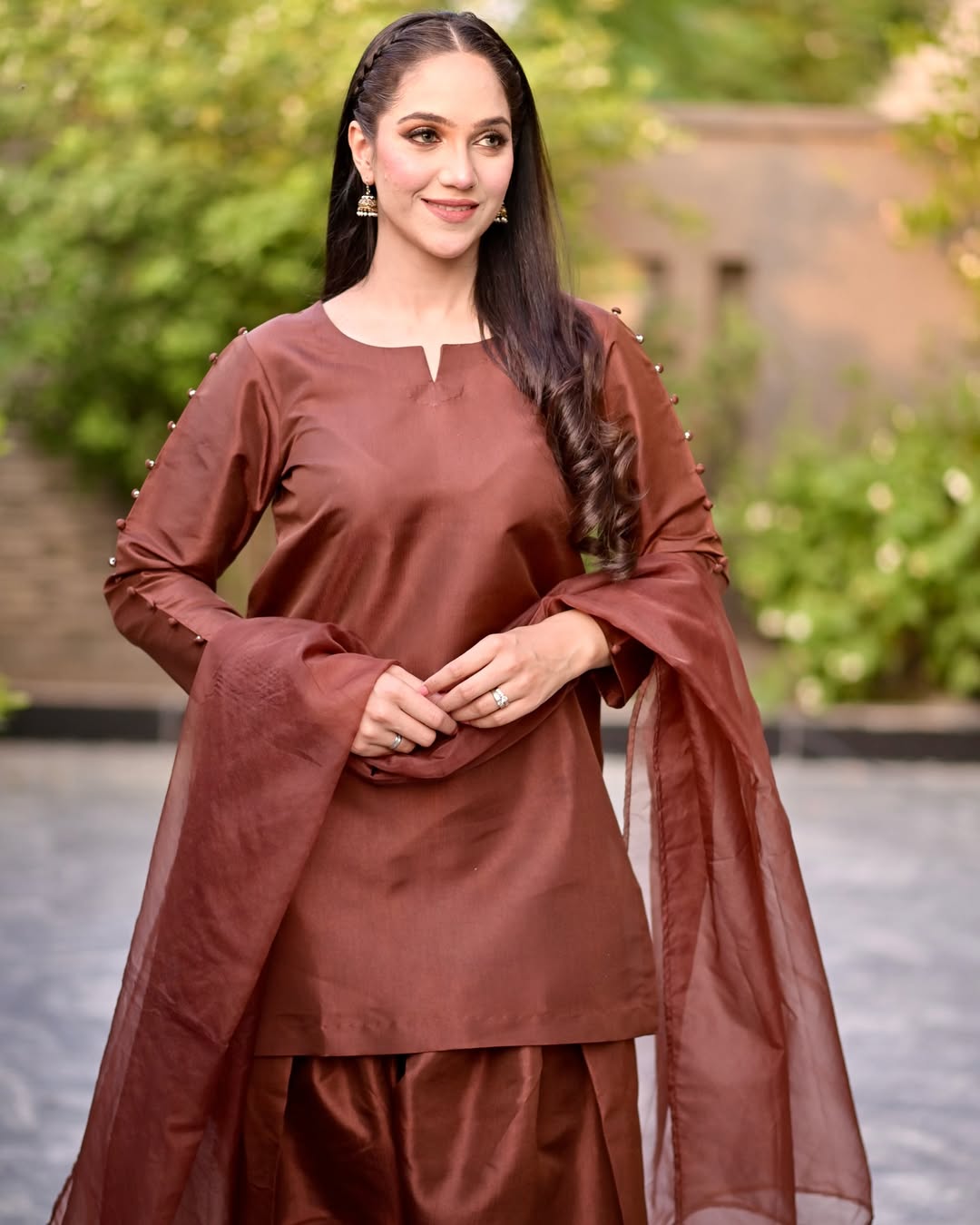 A timeless white ensemble with a shirt, farshi shalwar on shamooz silk, and an ethereal organza plain dupatta. Perfect for Eid with its elegant and festive charm.